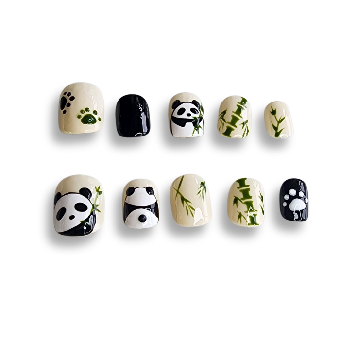 Nallio Bamboogie. Fun press-on nails featuring adorable panda faces and bamboo motifs on a shiny beige base. Level up your style effortlessly with these playful and chic designs!