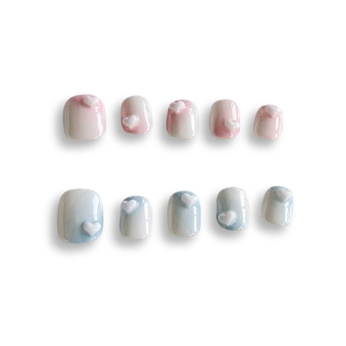 Nallio Cotton Candy. Embrace sweet and playful vibes with this delightful set! One hand features pastel pink nails adorned with charming 3D hearts, while the other boasts baby blue nails, also adorned with adorable hearts. Indulge in a whimsical twist to your manicure!