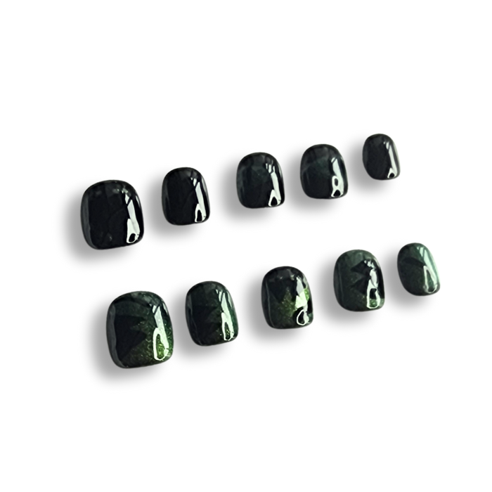 Nallio Easy Money. Elevate your style effortlessly with these short nails that promise to steal the spotlight. Their celestial, multi-dimensional finish captivates from every angle, with glittering highlights that transition seamlessly from sleek black to luxurious deep green, embodying the allure of wealth and sophistication with every glance.