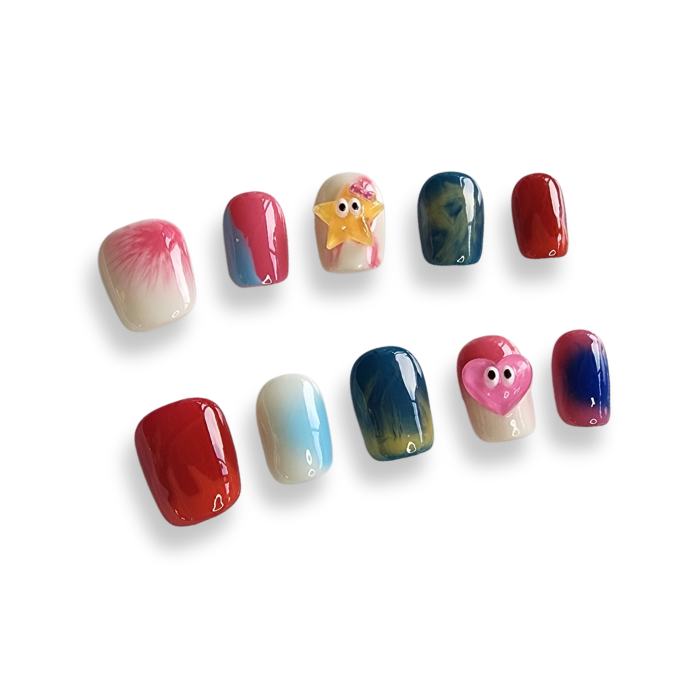 Nallio Jelly Beans. Get ready for a burst of fun with these lively nails featuring a different design on each finger! From vibrant multi-colors to playful 3D hearts, these nails are perfect for a weekend filled with excitement and joy. Let your fingertips reflect your colorful personality and make every moment a celebration!