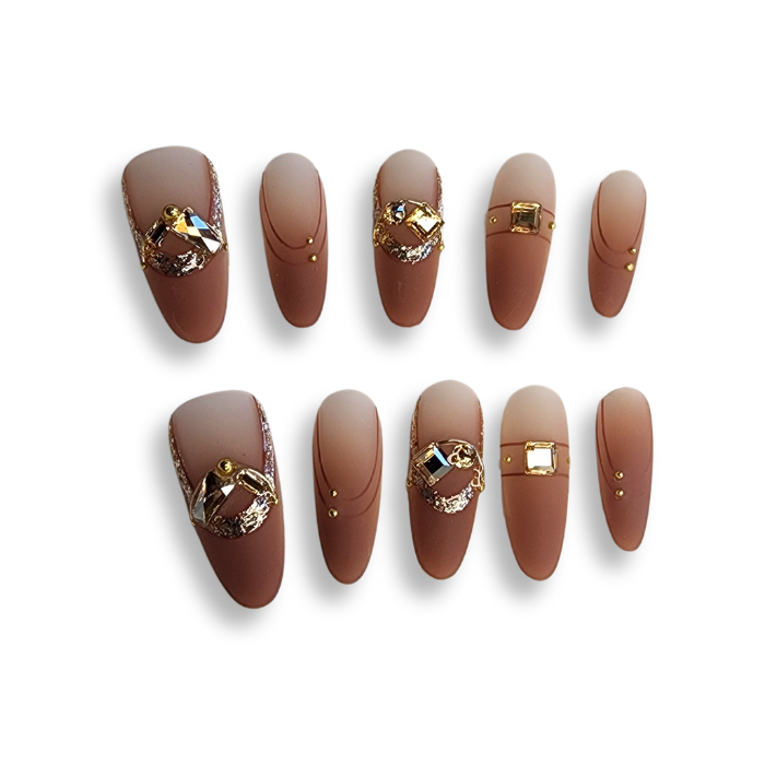 Nallio Knight. Embark on a journey of timeless elegance with these long, slenderizing nails adorned in a soothing nude tone reminiscent of tanned skin from your vaca in the Mediterranean Sea. Accentuated with jewel accents, each nail exudes sophistication and grace, capturing the essence of Mediterranean allure.