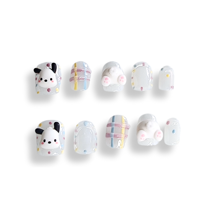 Nallio Playtime. Get ready for a playful adventure with these short, translucent nails adorned with charming 3D puppy tails and smiles. Radiating pastel hues perfect for the spring season, they invite you to embrace the joy of youth and innocence.