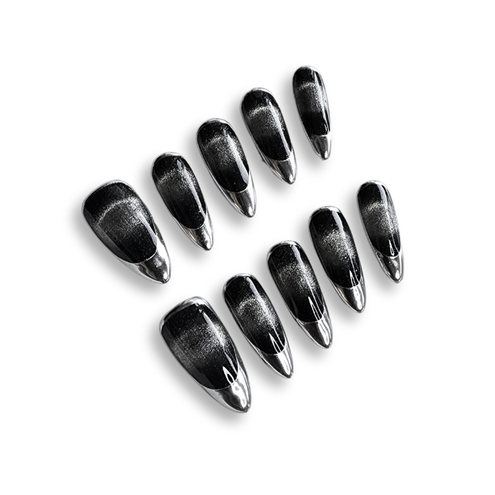 Nallio Radiant Slate. Embrace the allure of sophistication with these long, slender nails that exude elegance and mystique. Featuring metallic points and a cat-eye grey slate base, each nail casts a spell of dark magic with its magnetic shine.
