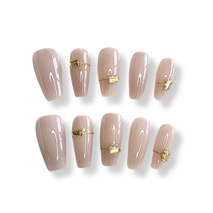 Nallio Whispers. Embrace understated elegance with these long, slenderizing nails in a soft nude blush hue. Delicately adorned with minimal gold accents, they exude a subtle glow that whispers of sophistication and grace. Let your fingertips become a canvas of quiet beauty with Whispers, the epitome of refined charm.